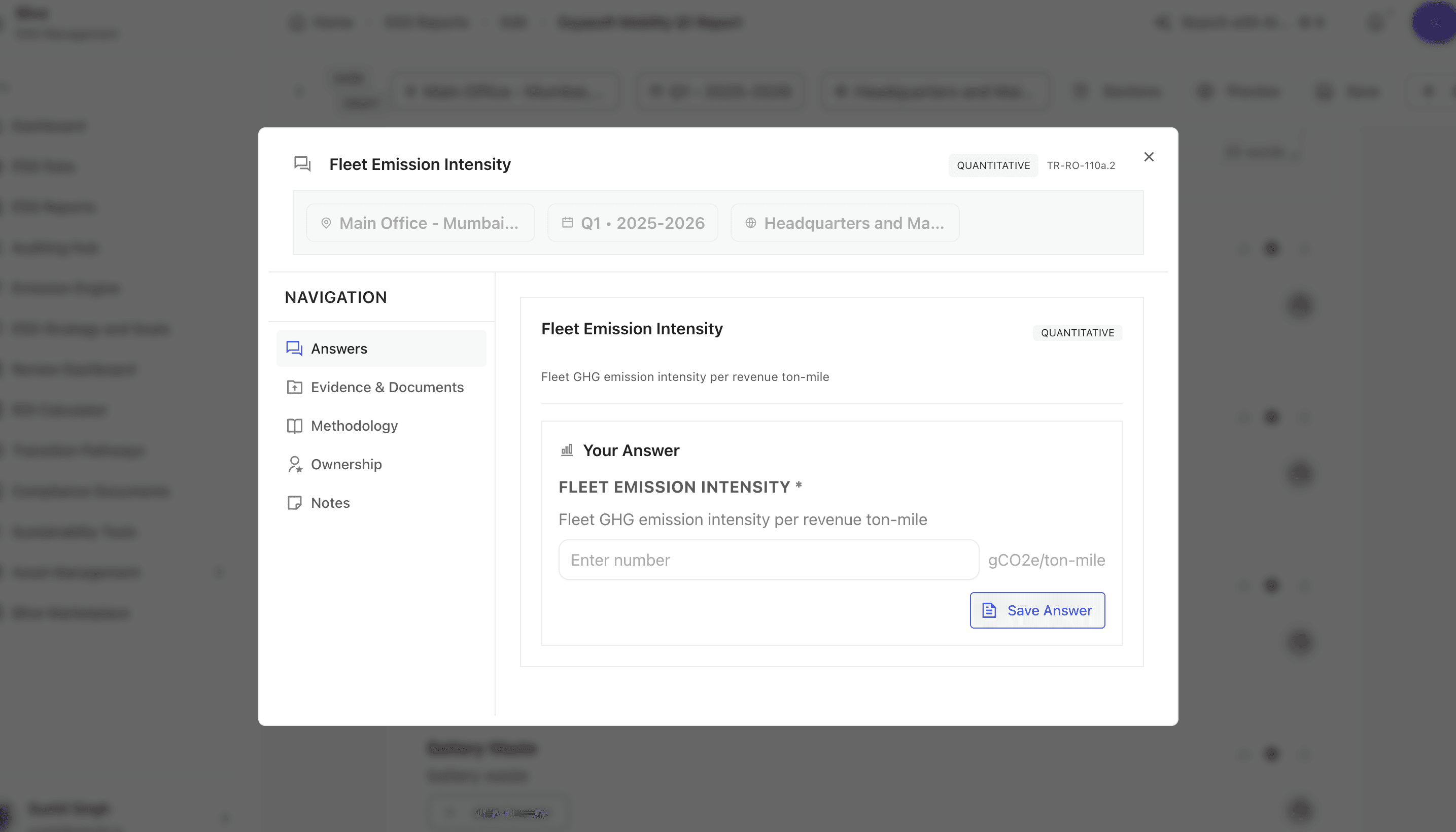 This module lets users input or validate ESG data points in this case, fleet emission intensity pulled from automated MRV (Monitoring, Reporting, Verification) pipelines.