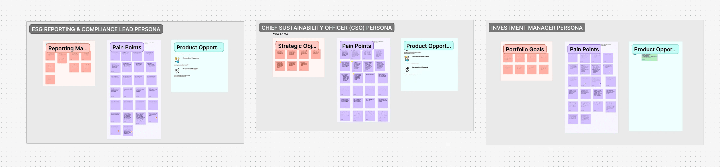 We synthesized user needs by clustering feedback using affinity mapping and created three representative personas to guide product thinking. These helped us reframe the problem around trust, clarity, and actionability in ESG workflows not just reporting.